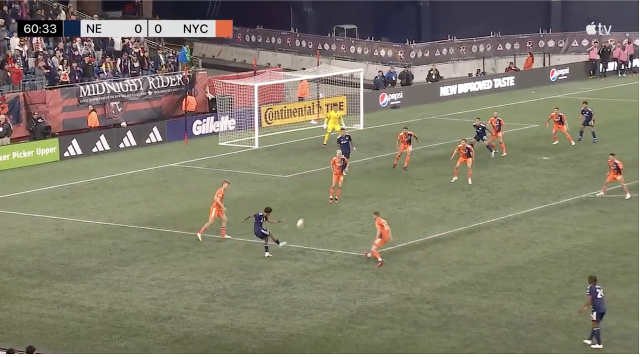 Matt: Both teams chose more open formations, with the Revs in a 4-2-1-2-1 formation to NYC’s 4-2-3-1. NYCFC tried to compensate for their lack of general momentum with their slappy-smacky defending and delaying tactics. The center ref made several gesticulating overtures during the match to discourage delays, but not one yellow card, even after the NYCFC keeper took about 21 seconds to get the ball back in play on a goal kick. The Borrero goal pulled back was unacceptable in my opinion. The explanation given was that Bou was offside, not playing the ball, and blocking the GK view. Bou might have been offside at that moment, but he was doing what all strikers do - try to ride the offside line so he can be ready. And as you can see from this screenshot, the GK is not shielded. Then, three days later, we find out PRO told Arena the goal should have been allowed. BAM.